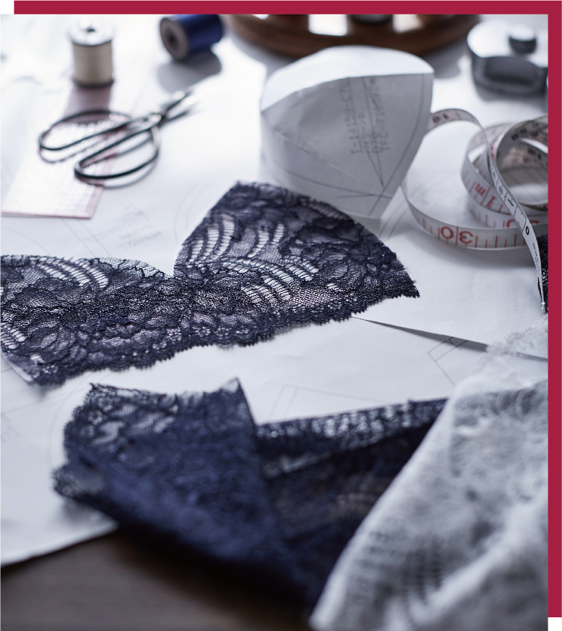 使用する生地・レースの特性によって裁断や縫い方もさまざま。素材ごとに異なる特性を考慮してパターンを設計し、モニターを繰り返し行い、お客様に満足していただける製品を開発いたします。
